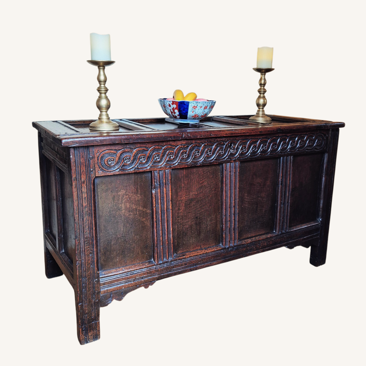 Oak Carved and Panelled Coffer. Circa 1680.